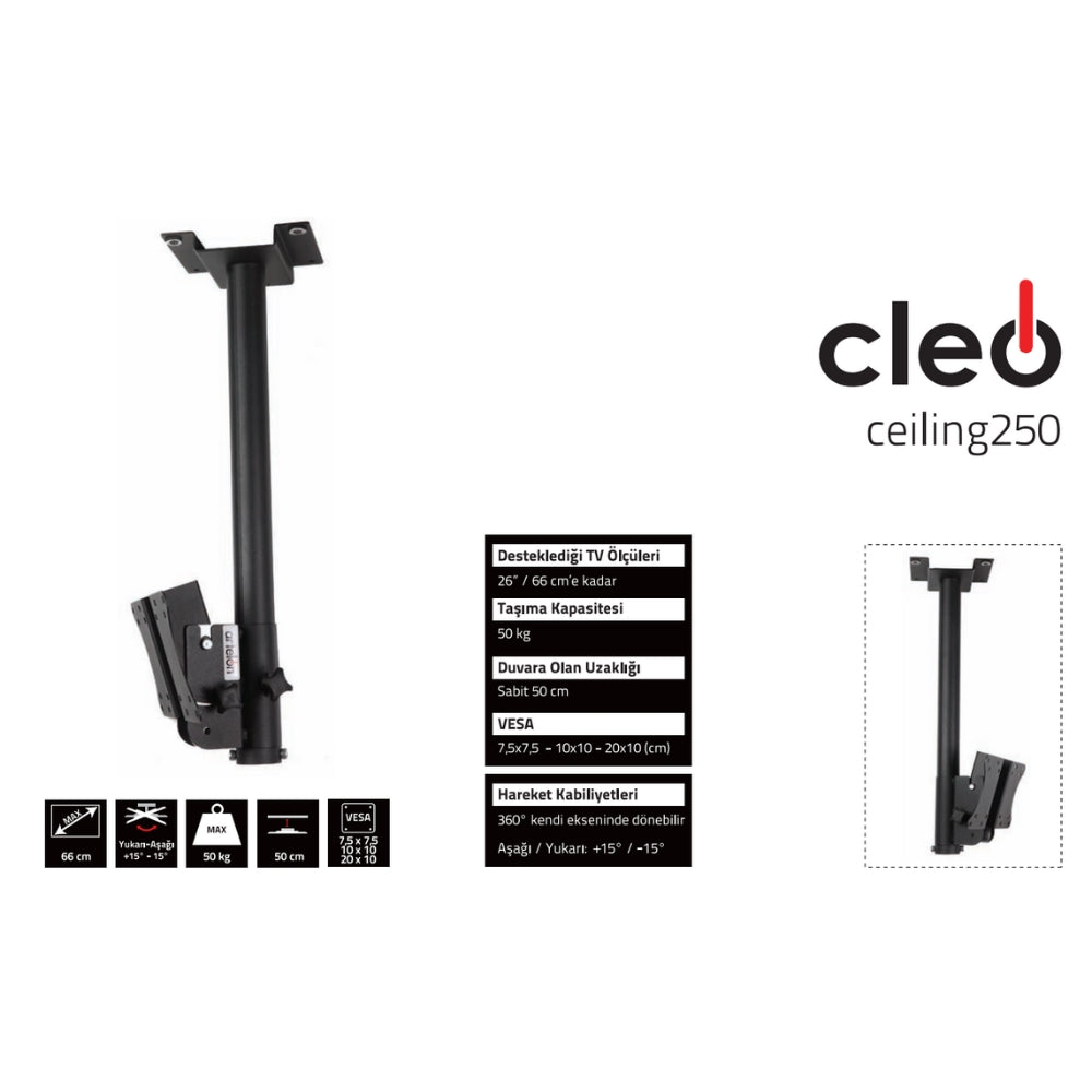 Artelon Cleo Ceiling 250, kompakt ekranlar için özel olarak geliştirilen, sabit uzunluklu, dayanıklı ve şık bir tavan askı aparatıdır. 360° dönebilme ve eğim ayarı özellikleri sayesinde televizyonunuzu dilediğiniz açıya göre konumlandırabilir, ev ya da ticari alanlarda yerden tasarruf sağlayarak modern bir kurulum gerçekleştirebilirsiniz.